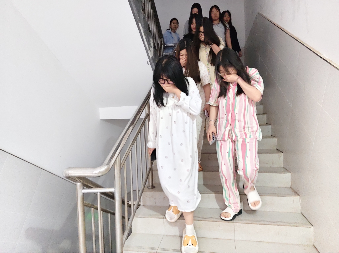 5月27日晚19:00,,,宿舍区夜间消防演练准时开始。。。。男生宿舍区由刘天天老师负责组织协调,,女生宿舍区由赵江涛老师负责协调指挥。。。两位老师全程在宿舍楼下集合点值守,,,,确保演练有序进行。。。。全体学生按照预先制定的疏散方案,,捂住口鼻,,弯腰低姿态,,,,沿着指定的疏散路线,,,,快速、、、有序地撤离至安全区域。。。。