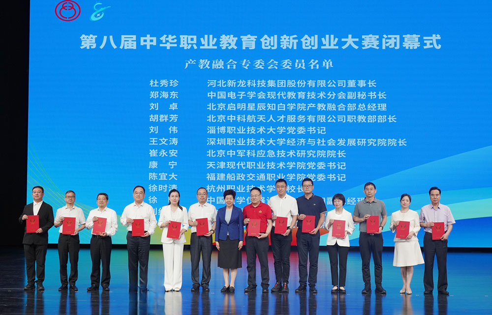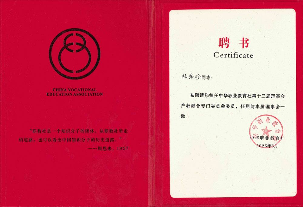 会议现场,,集团董事长杜秀珍获聘中华职业教育社第十三届理事会“产教融合专门委员会委员”,,,,全国政协副主席、、中华职业教育社副理事长秦博勇亲自为其颁发聘书,,,,充分肯定董事长杜秀珍在推动产教融合、、、、校企协同领域的突出贡献。。。