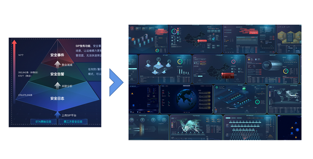 √ 16块可视化大屏,,,,直观展现全网态势,,,,帮助客户看清全局,,,,找到病症,,,精准消杀处置。。。。